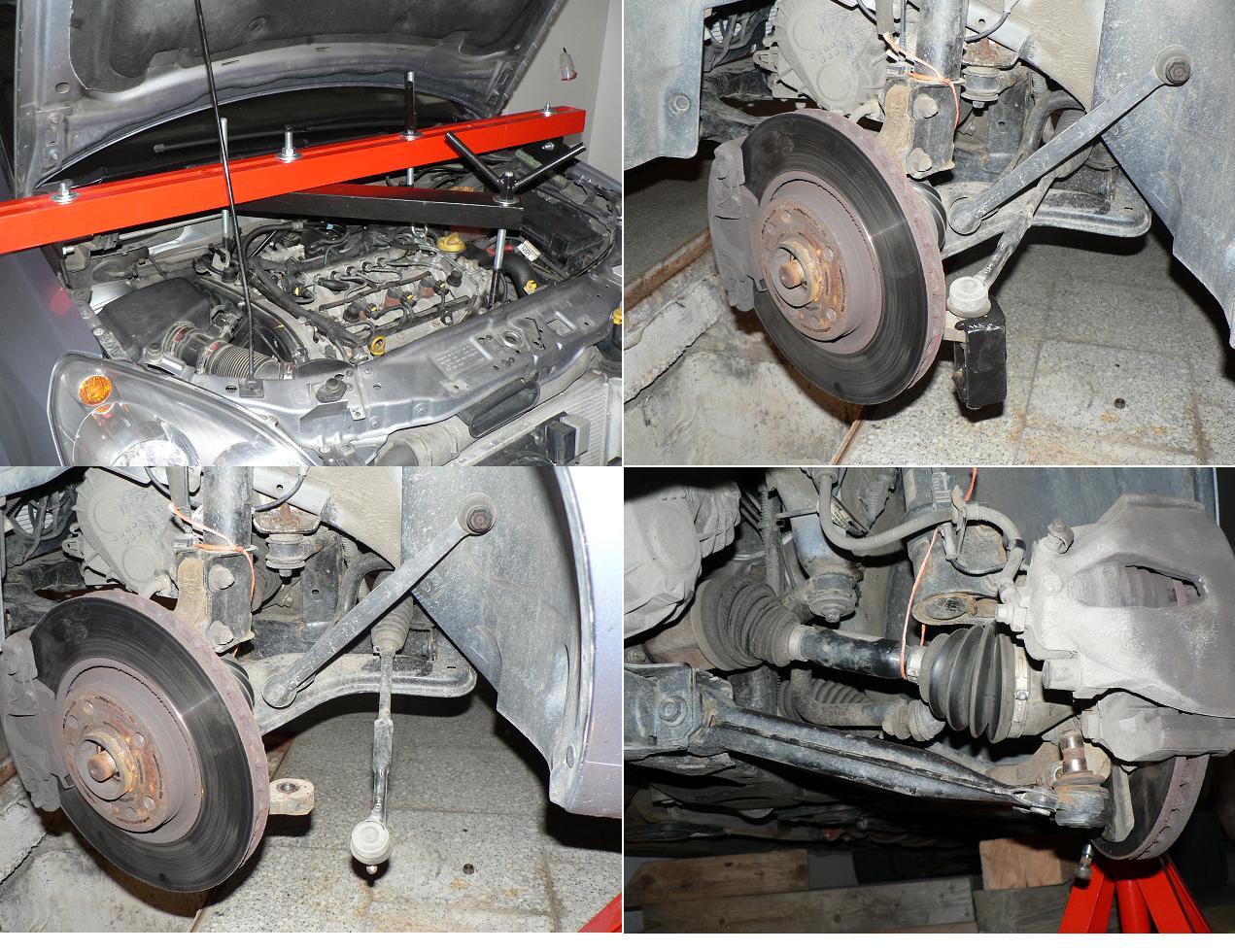 6. Zavěsit motor, demontovat stabilizátory L a P, spojovací tyč řízení L a P přípravkem, vodící kloub z čepu kola L a P.