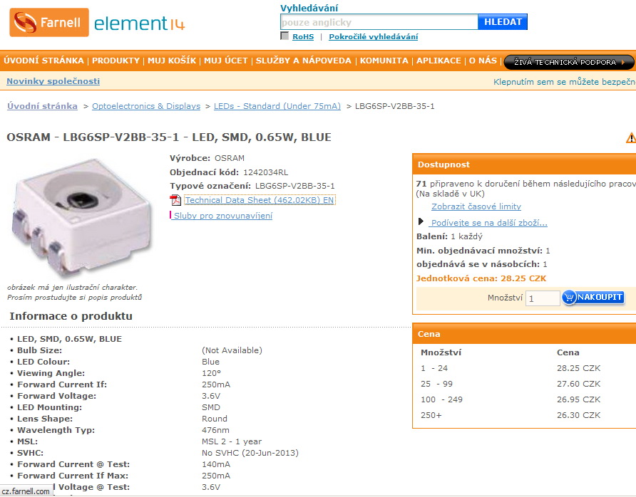 Katalog ZDE a skladem je mají ZDE za 28 Kč bez DPH. Velmi snadno od Farnellu zakoupíš přes http://www.rothsware.cz – platí se v CZK, dodání do několika málo dnů, ceny stejné jako u Farnellu a poštovné je za 100 Kč (Balík do ruky).