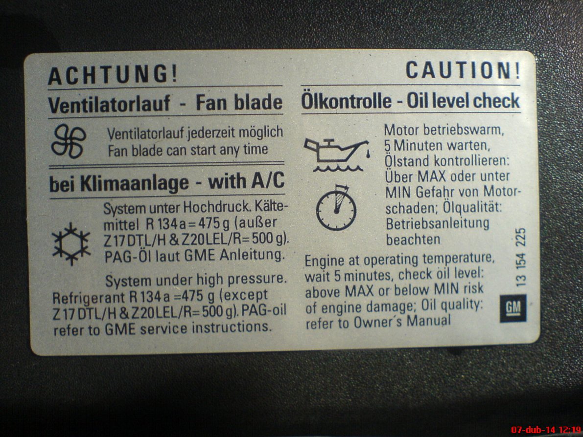 Pri klime - system podd vysokym tlakom. Chladiaca napln R134a = 475g (okrem Z17DTL/H a Z20LEL/R, kde = 500g). Ohladne PAG-oil konzultujte servisne pokyny GME.