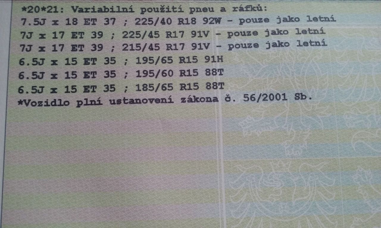 Jinak pokud je strach, doporučuje jezdit na stk vzimě na zimních origo, tam je jistota... Ale tím neříkám, že v létě jezdit na něčem nelegálním. Pěkně v TP, ale těžko bude někdo při nehodě řešit +/- 3-5mm na ET, když je dodržen rozměr pneu a index rychlosti. To je zajímá! Vždy´t já teď jezdím na Astruli 18ky léto i zima, obojí rozměr 225/40 ty zimní jsou daleko užší, než letní, až dělají áčka. Stím má zkušennosti i u motorky. Stejný rozměr podle čísel, ale totálně jiná pneu. A to ža tak, že se nevešla do vidlic!!! To samé u auta. Co výrobce, to jiná pneu... To je podle mě daleko větší problém. Všichni se řídí čílsem, který si tam vylisujou, ale že rozdíl v pneu různých výrobců je i několik cm, to nikdo neřeší. Proč by měl někdo řešit, jestli máš osu disku o 3mm víc ven, nebo dovnitř... To nikdo ani nenaměří.