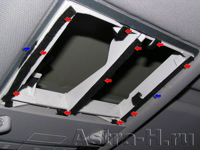 A moje rada pro ostatni - resil jsem rezonovani stropniho osvetleni, postupoval jsem dle navodu na ruskych strankach, ovsem bez vysledku. Pomohlo az nalepeni tlumici pasky na misto modre sipky na obrazku. Dokonce jsem pasku z ostatnich mist (cervene sipky) sundal a nechal pouze na miste modre sipky - zadne pazvuky, jen krasne ticho
