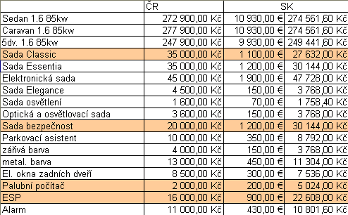 jj muj názor je taky že esp a 6 báglů by měl bejt standard, u sedana bohužel 6 airbagů nejde objednat tak sem si objednal aspoň to ESP, jinak sem si dovolil udělat takovou srovnávací tabulku cen v čr a sk a vyznačil sem tam největší cenový rozdíly, kurz dle ČSOB (valuty, prodej)