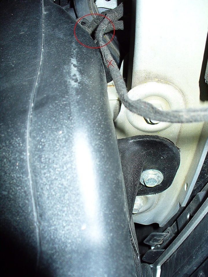Káblík od čidla vede ve svazku v tom husím krku - je vidět na obr. za baterkou . Vede to dolů k chladiči , kde se to rozbočuje na 3 káblíky - jeden dolů na čidlo a ty dva někam k chladiči ( kam přesně to nebylo vidět ) . Tak snad ti to pomůže