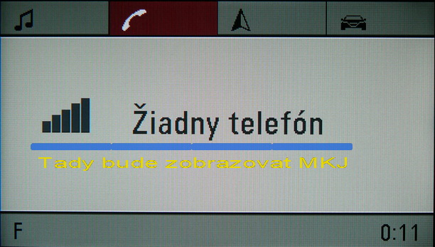 a) v sestavě CD30/MP3 + starý GID (komu nyní MKJ funguje, má starý GID) bez instalovaného UHP, kde musí být nyní aktivované záložkové zobrazení (změnou variantní konfigurace displeje GID – UHP přítomen), se oživí funkce nyní slepé záložky. V záložce začne svítit ikona telefonního sluchátka (změnit ji na něco jiného asi nedokáži) a v řádku na hlavní záložce (původně se zde zobrazuje název operátora nebo stav připojení telefonu – viz. foto) se bude zobrazovat teplota chladící kapaliny motoru a plus možná ještě něco a při kliku na ikonu sluchátka se otevře menu MKJ, tj. už nebude nutné pro vstup do menu MKJ mačkat tlačítko BC