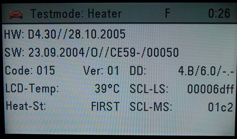 stisknout tlačítko MAIN, stisknout a držet tlačítko SETTINGS tak dlouho, dokud se neobjeví okno s textem „Testmode switched on“ (navigace také pípne). Potom opakovaným stiskem tlačítka BC nalistujete stránku Testmode: Heater, na které je HW a SW verze displeje. Opakovaným stiskem tlačítka AUDIO nalistujete stránku HARDWARE, na které je HW verze navigace. Deaktivace Testmodu se provádí takto: stisknout tlačítko MAIN, stisknout a držet tlačítko SETTINGS tak dlouho, dokud se neobjeví okno s textem „Testmode switched off“ (navigace také pípne).