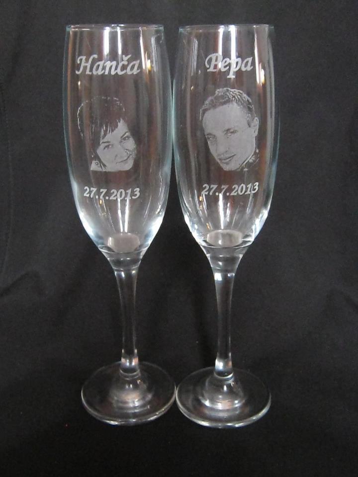 NOVINKA!! Díky přenastavení optiky laseru ,dokážeme dělat fotky i do oblých tvarů ,jako jsou např. šampusky.Sada svatebních skleniček s fotkou 500 kč.