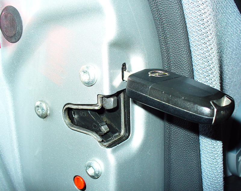 V každých dveřích je na boku u zámku štěrbina do které se v případě nouzového uzamčení strčí klíč - až to mírně cvakne . Pak se dveře zabouchnou a je nouzově uzamčeno ;) Pak se klíčem v předních dveřích ručně odemče a zadní se odemknou ruční páčkou na dveřích . Zadní dveře kufru se uzamknou centrálním uzamykáním , z místa spolujezdce - to co je nad rádiem vedle výstražných blinkrů ( tak se dají taky uzamčít všechny dveře nouzově - pak vylezeš spolujezdcem a zabouchneš )