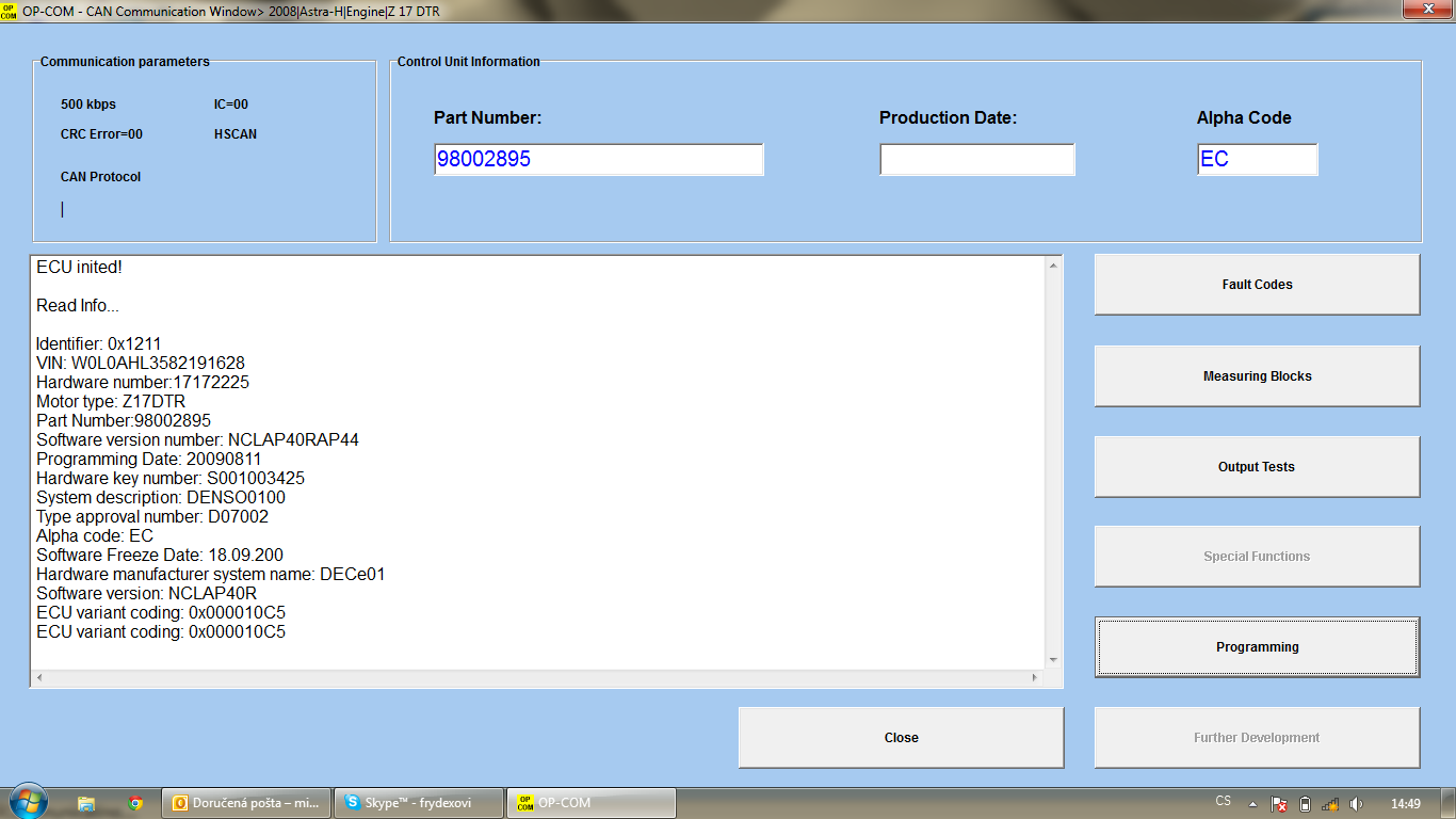 ne. Na té stránce se pouze dozvíš, jaká aktuální verze je pro požadovanou ŘJ k dispozici, tzn. jakou verzi by ti do ŘJ naprogramovali v autorizovaném servisu. Jakou verzi ve skutečnosti v jednotce máš zjistíš pouze přes diagnostiku. Když se ti OP-COM spojí s ŘJ motoru, v levém okně ve výpisu by měly být veškeré údaje včetně verze SW.Frydex píše:Mi ta stránka vyhodila tohle... znamená to, že už to mám taky přeprogramované ?