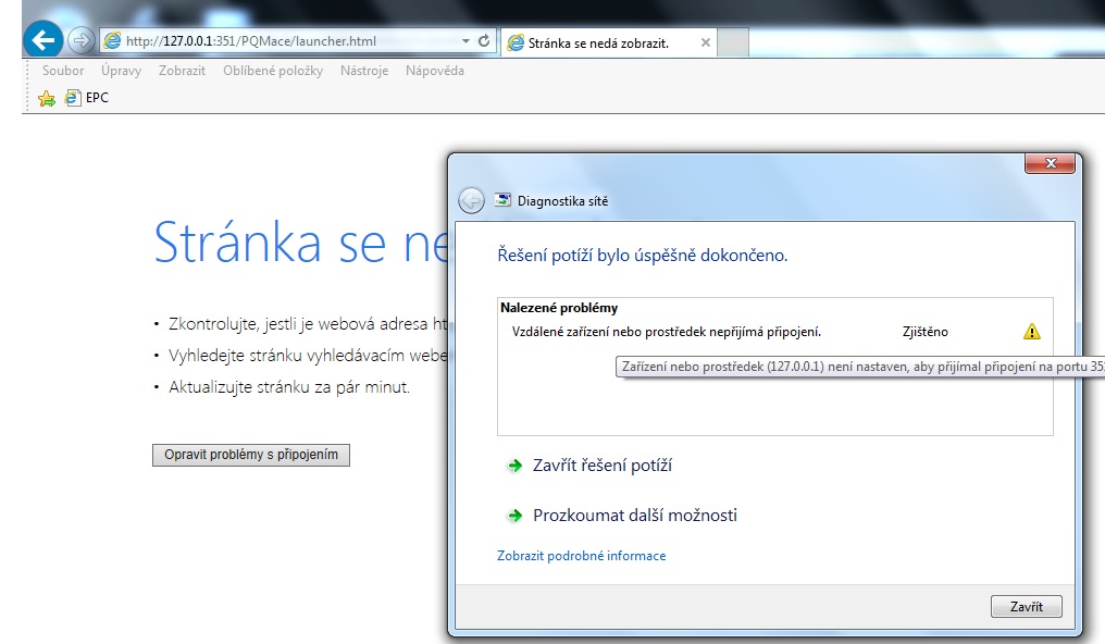 Tak jsem vycistil PC pomoci programu CCleaner, ale bohuzel to nepomohlo( i kdyz se smazalo 18GB dat). Porad mi to pise: "Zařízení nebo prostředek (127.0.0.1) není nastaven, aby přijímal připojení na portu 351." Mate taky pouzitou tuto adresu jako ja??? http://127.0.0.1:351/PQMace/launcher.html