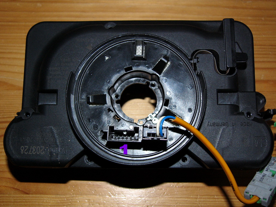 přes otáčející se kroužek s namotaným plochým kabelem vedou signály z do konektoru pozice 2, pozice 3 označuje pro ilustraci vytažený konektor z pozice 2