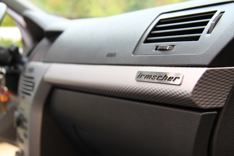 -logo Irmscher na lište pred spolujazdcom, zatiaľ nalepené na povrchu s čiernym pozadím, plán je ale logo zapustiť do lišty a podsvietiť nápis asi na červeno/príp. bielo matným plexisklom