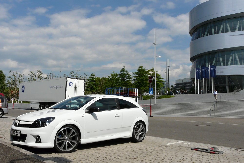 Kluk si navíc týden před odjezdem vyvrkl kotník a tak jsme ještě sháněli nějakou "kriplkáru" abychom se někam dostali, jelikož o berlích by nikam moc nedošel (je mu 9). Přikládám jednu fešnou Astrřici GTC OPC Nürburgring Edition s Mercedes Muzeem v pozadí.