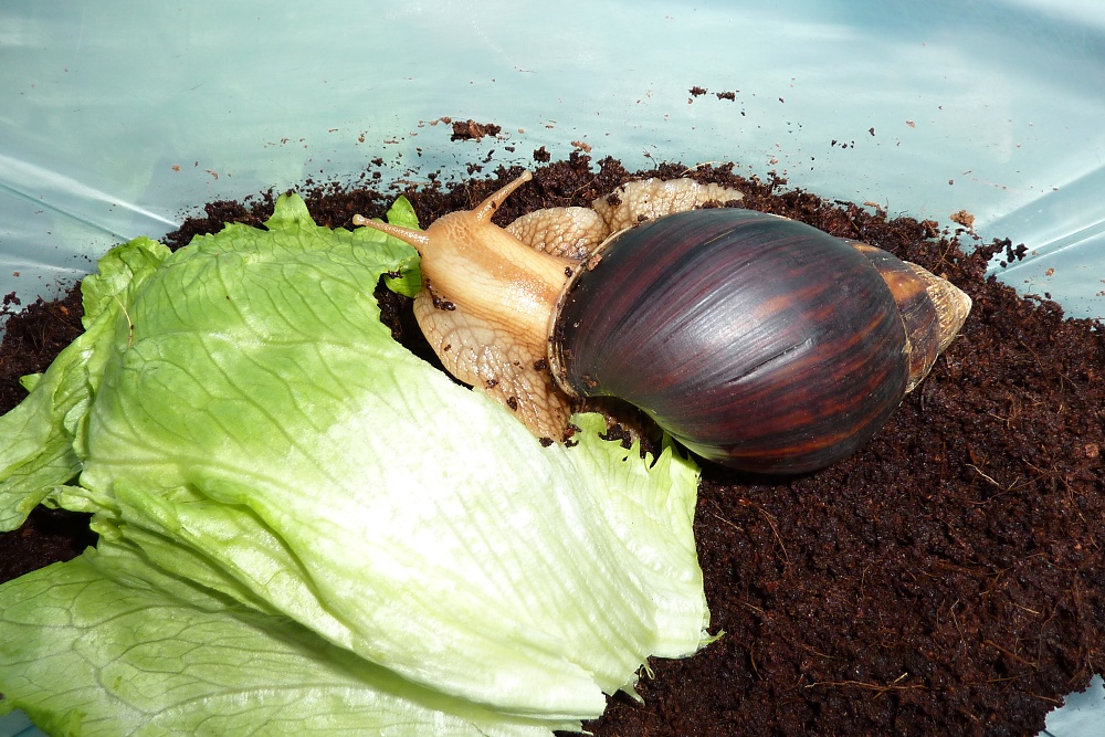 ...je to africký obří hlemýžď Achatina. Ten náš má teda zatím asi jen 10 cm