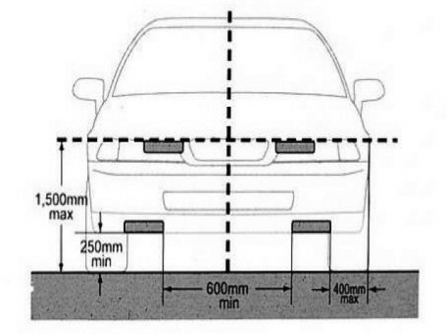 . Vzdálenost světel od bočního obrysu je max. 400 mm a vzájemně mezi světly min. 600 mm (u vozidel s šířkou menší než 1300 mm je povolena vzájemná vzdálenost 400 mm).