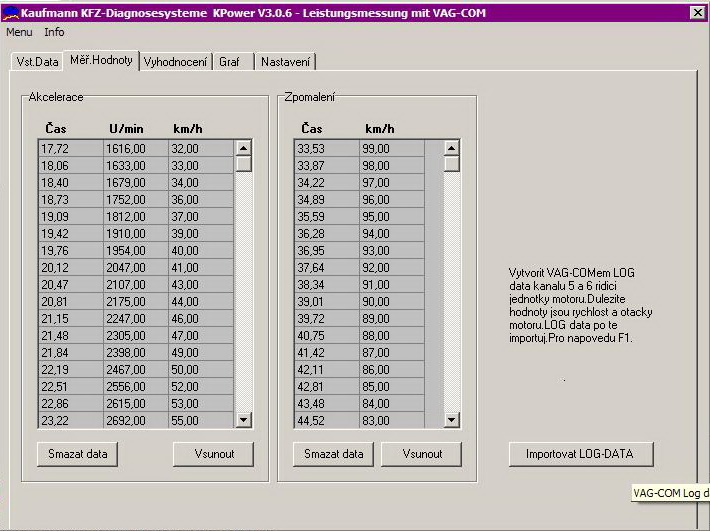 Pro koncernovou diagnostiku VAG-COM existuje doplňkový prográmek KPower, který umí ze zaznamenaných dat (čas, otáčky motoru a rychlost vozidla) vypočítat výkon motoru a kroutící moment, resp. závislosti výkonu a kroutícího momentu na otáčkách. A jelikož KPower umí měřená data importovat a OP-COM zase exportovat ve formátu *.csv, lze ho použít i pro měření výkonových charakteristik vozů OPEL. V příloze moje první měření – nebylo provedeno v ideálních podmínkách a ještě zkoumám, proč je graf oproti VAGem měřeným datům tak zubatý… nicméně změřené hodnoty nejsou snad úlně mimo mísu