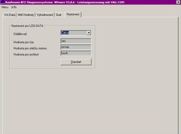 6) v KPoweru se na kartě nastavení musí vyplnit odpovídající oddělovač parametrů a popisky. Pro CZ OP-COM se nastavuje čárka, sec, ot/min a km/h (viz. obrázek v příloze pro CZ OP-COM)