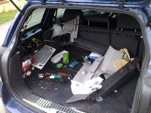 Sám bych si na to netroufnul, tak poprosil jsem šikovného kamaráda autoelektrikáře. Prvotní úkol byl sundat stropnici. Jenže sundání stropnice = odstranění všech sloupků v autě + držák na tu lištu v kufru. Po sundání stropu jsme provrtali díru do nosníku mezi B-sloupky, kam jsme navrtali nosný plech přehrávače (byl součástí balení). Natáhli jsme kabel od zadního elektrického centra až k DVD. Nandali jsme zpátky stropnici, do ní jsme pak vyřízli otvor pro kabel a alespoň pro 2 šrouby pro spojení přehrávače a nosného plechu (dalšími 4 už jsme pak jen prorazili stropnicí, jelikož už jsme nemohli minout díru v nosném plechu). No a namlátili jsme všechny plasty zpátky do auta. Píšu v množném čísle, ale já se se svou šikovností podílel jen minimálně, v podstatě jen při sundání stropnice a celkovou psychickou podporou