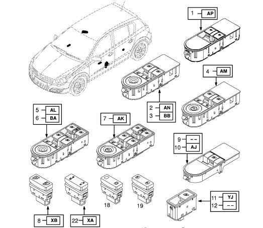 SPÍNAČ OKNA PŘEDNÍCH DVEŘÍ ÚPLNÝ, ANTRACITOVÁ ČERŇ (IDENT AM) (STRANA U ŘIDIČE) (PRO ELETRICKY OVLÁDANÁ ZPĚTNÁ ZRCÁTKA) (POUŽIJE SE S EL.SKLÁDACÍMI ZRCÁTKY): 62 40 330